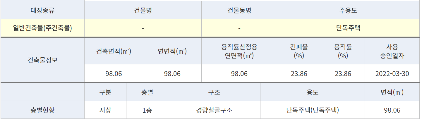 대지면적 : 411 ㎡ (124평) / 건축면적 :98.06 ㎡ (30평)